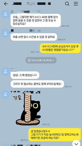 하지만 저희 러브앤캣이 24시간 언제든지 급한 일이 생겼을 때 바로 달려갈 것입니다.